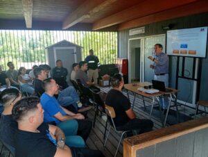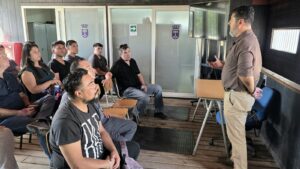 El jefe del Departamento de Seguridad, Mauro Mercado, junto a la gerenta del Proyecto Patrullas Regionales, Isabel Flores, y el coordinador operativo, Rodrigo Herrera, participaron en el programa de capacitación y preparación de los 19 nuevos patrulleros del Programa de Vigilancia Eje Alameda, en la comuna de Estación Central.